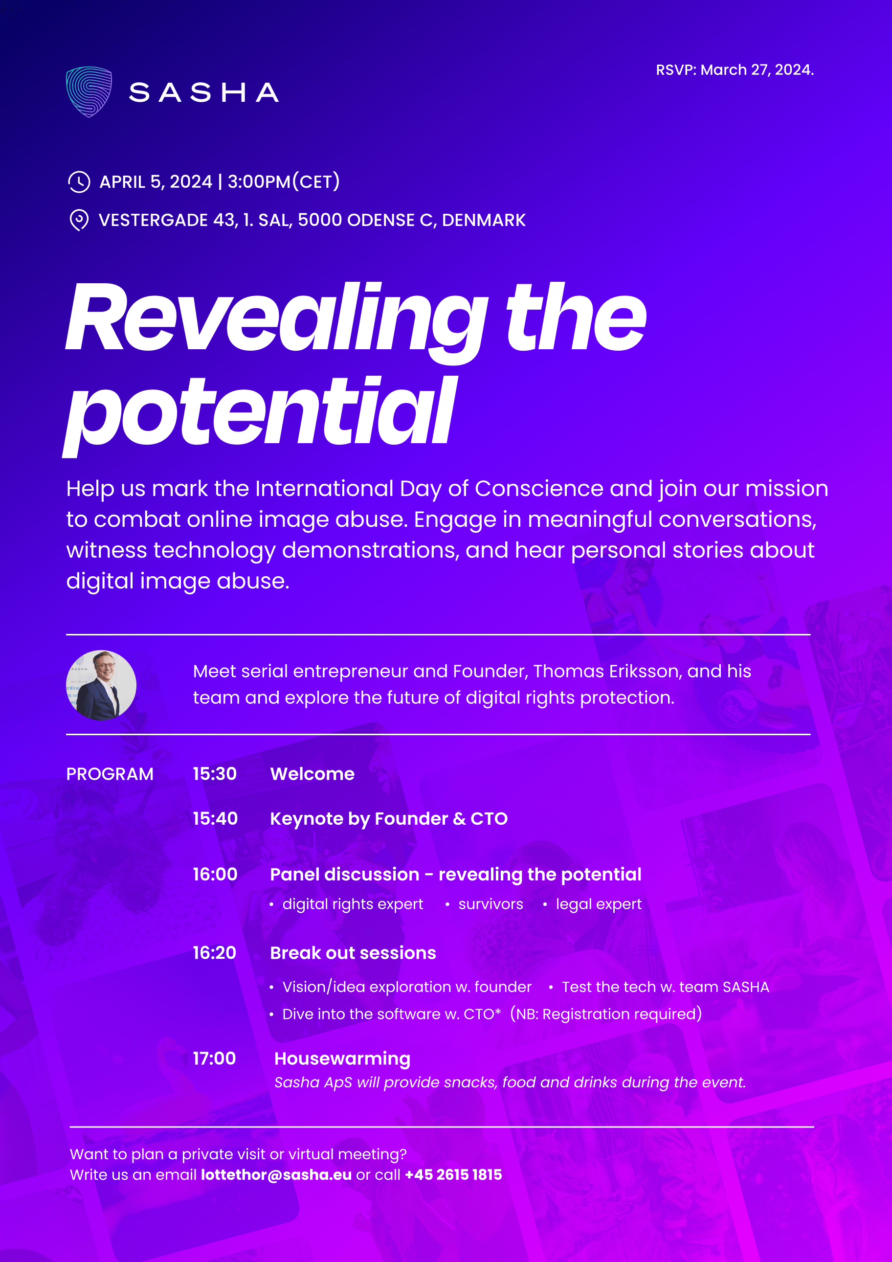 Sasha ApS, a Danish startup specializing in image protection technology, announces its event "Revealing the Potential" to mark the International Day of Conscience. Scheduled for April 5 in the historic city of Odense, Denmark, the event aims to raise awareness and foster discussions on combating online image abuse, coinciding with the recent implementation of the EU's Digital Services Act.